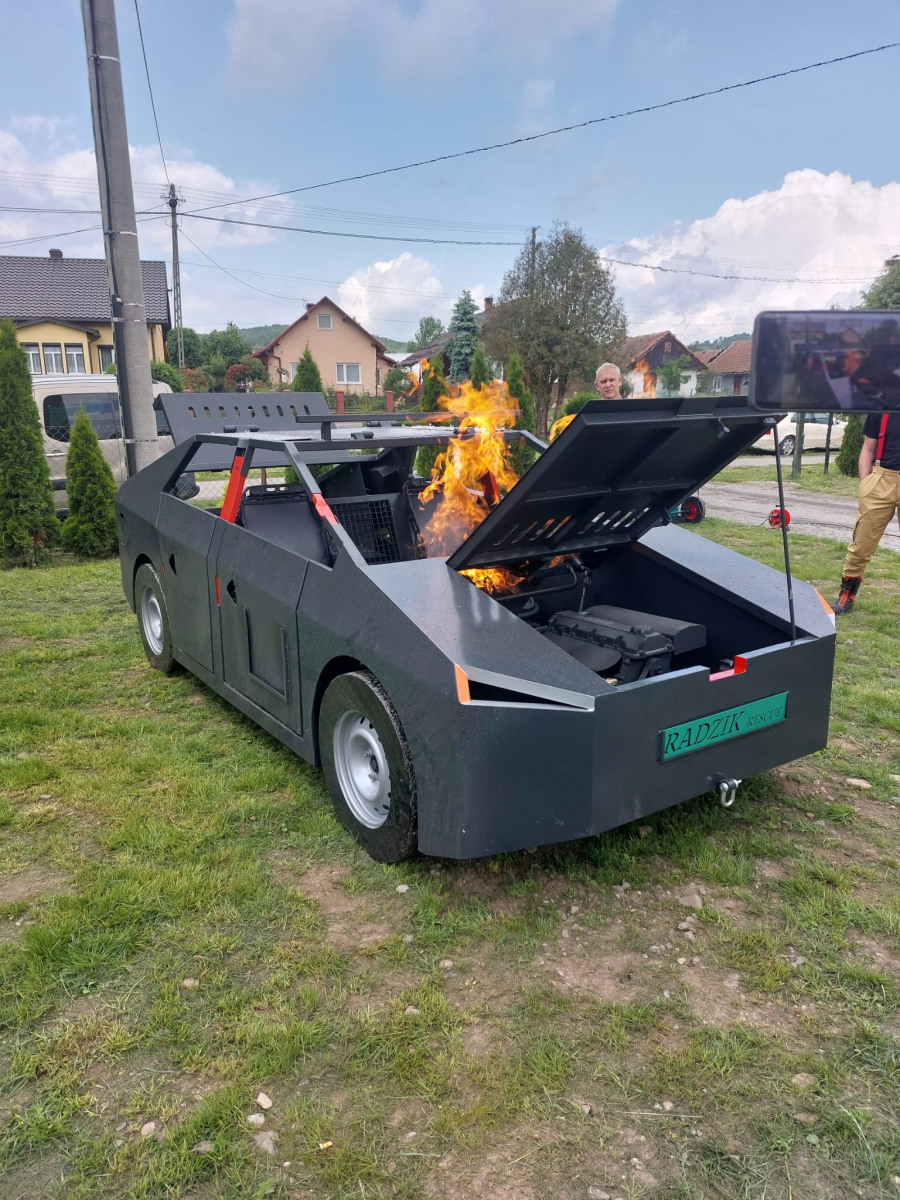 Drugim elementem dostawy jest mobilny trenażer pożaru samochodu, który umożliwia praktyczne szkolenie w zakresie gaszenia pojazdów objętych ogniem. Urządzenie pozwala na symulację różnych scenariuszy – od pożaru komory silnika po zapłon wnętrza kabiny.